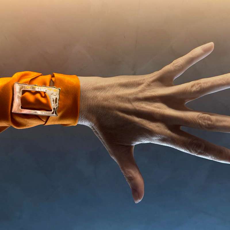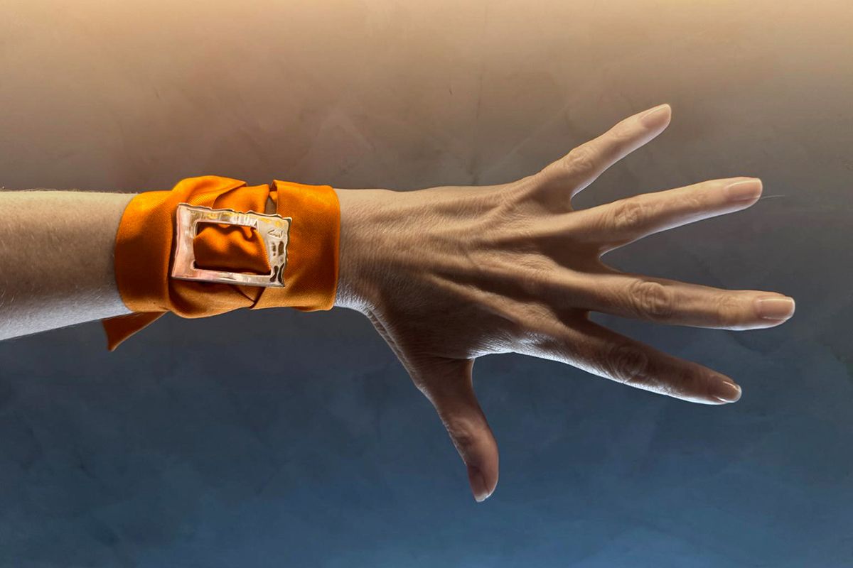 Solid Silver Bracelet with Natural Silk Ribbon. June Crespo Collection.